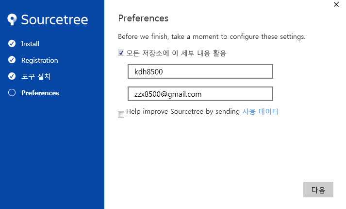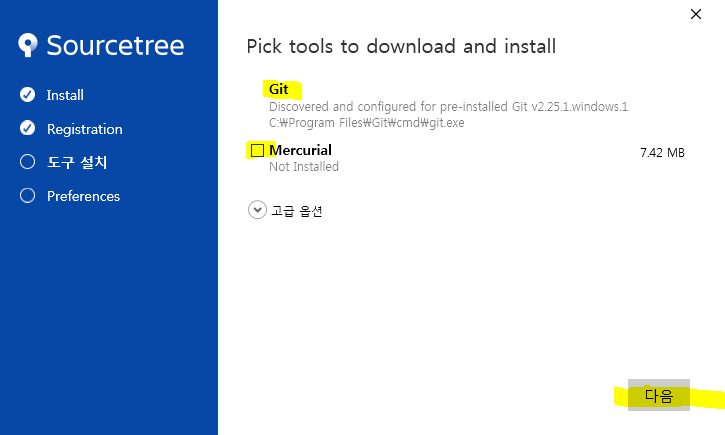-Mercurial은 Sourcetree에서 제공하는 git과 같은 툴인데 나는 git만 사용할 거라서 체크 해제.