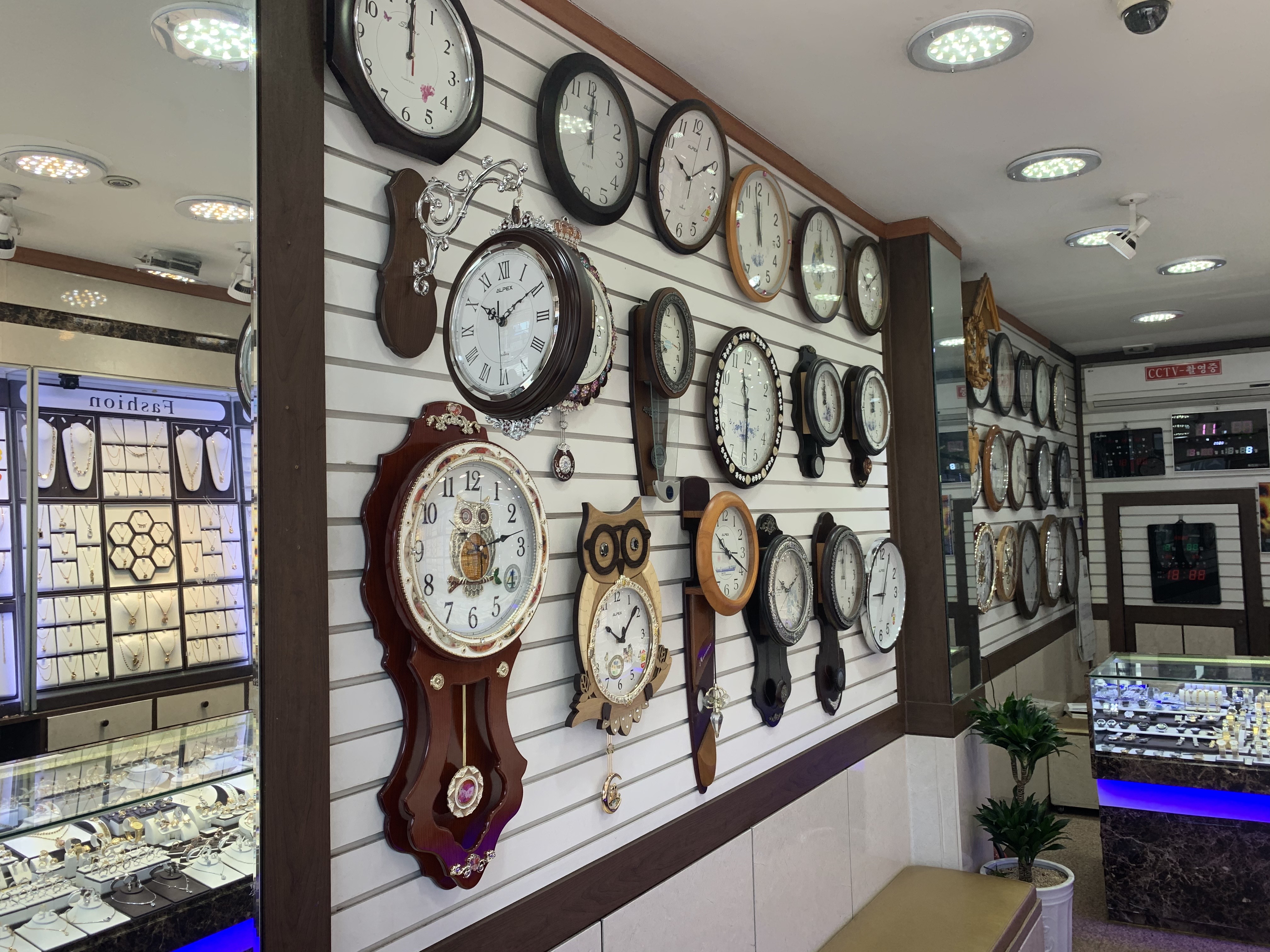 왼쪽 벽에는 많은 시계들이 걸려있다.