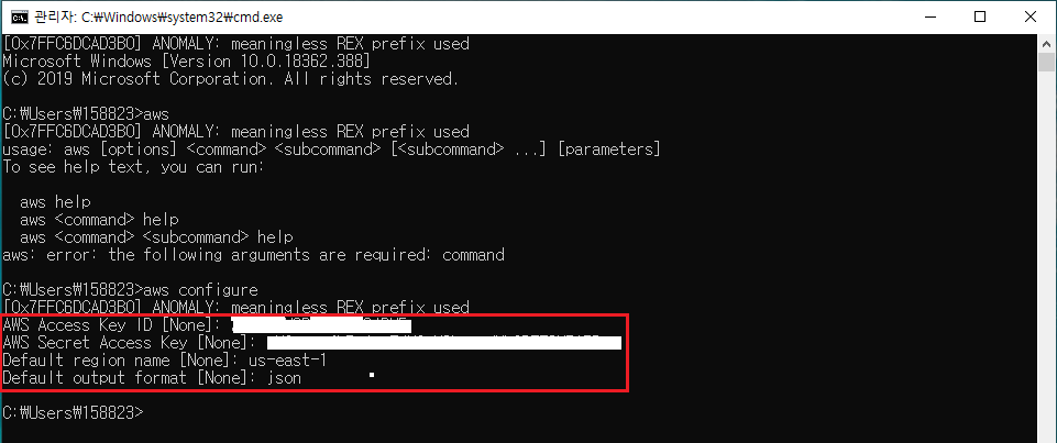 AWS Access Key ID [None]: 액세스 키 입력