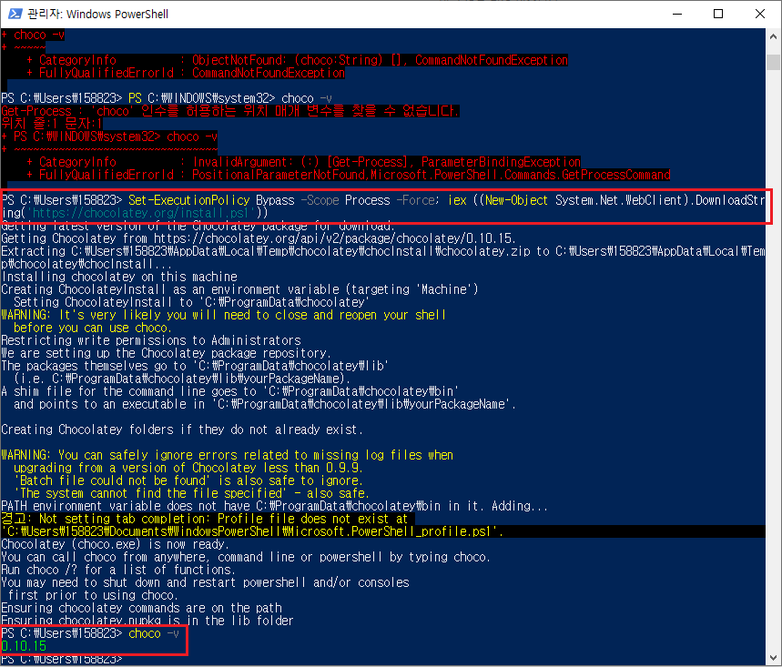 Windows PowerShelll을 관리자 권한으로 실행하여