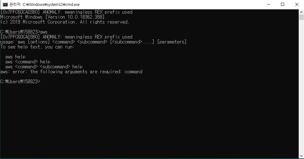 cmd에서 aws 명령어가 정상 작동하는지 확인한다.