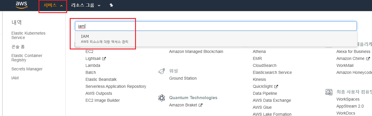 [서비스] 탭에서 IAM을 검색한다.