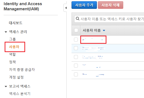 IAM 화면 좌측에서 [사용자]를 클릭한 후