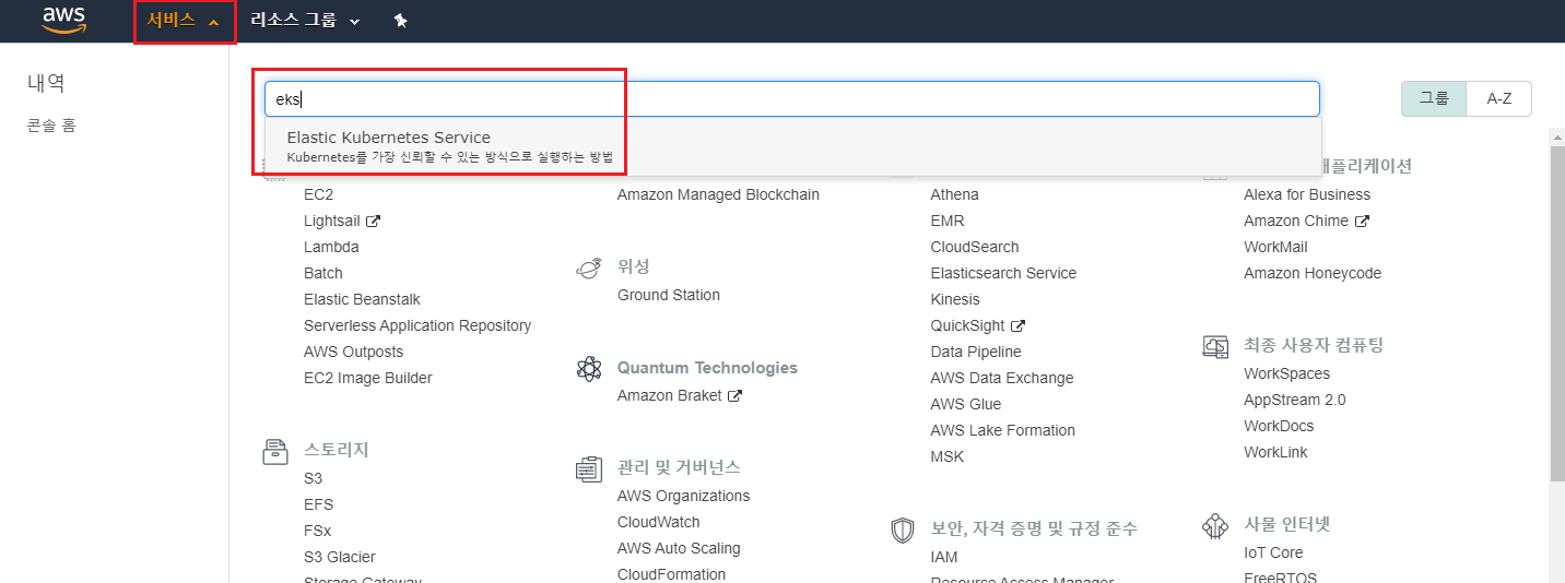 AWS 서비스에서 eks를 검색하여 접속한다.
