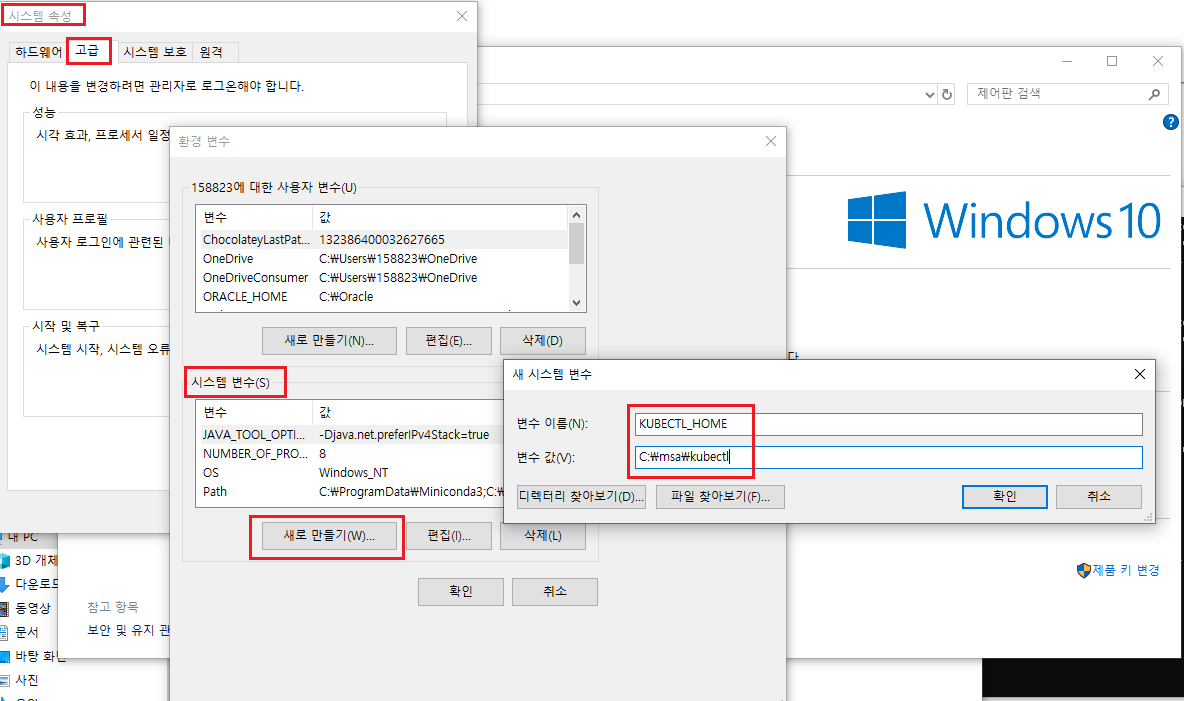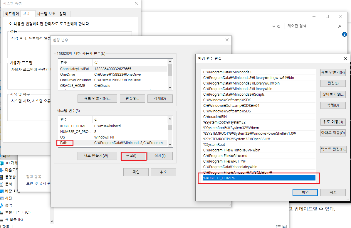 [환경 변수]에 kubectl.exe 파일 경로를 등록한다.