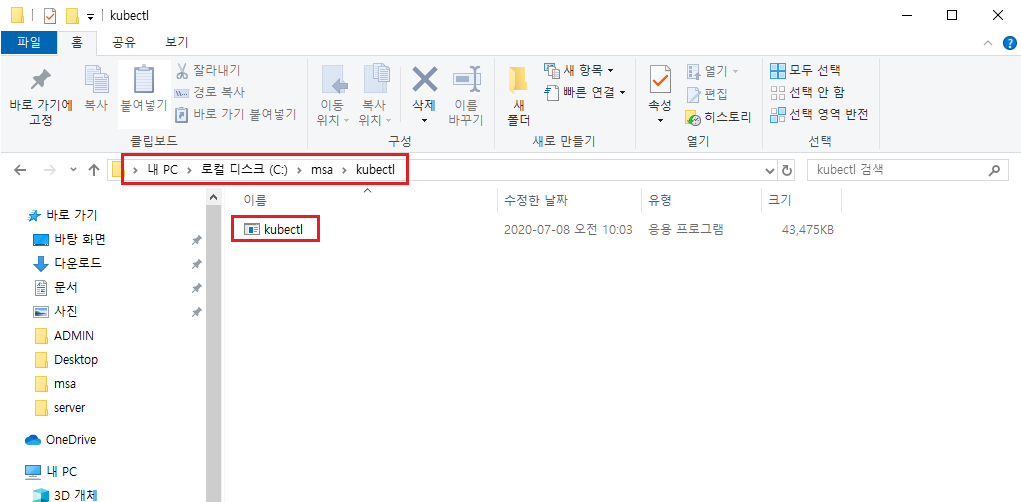 변수 값: C:\msa\kubectl
