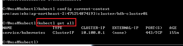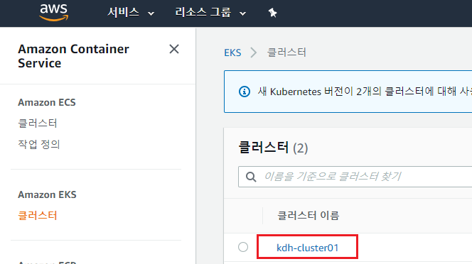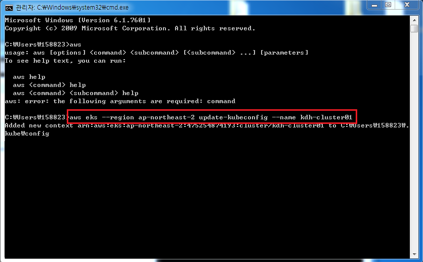 ex) aws eks --region ap-northeast-2 update-kubeconfig --name kdh-cluster01