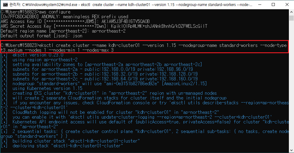 ex) eksctl create cluster --name kdh-cluster01 --version 1.15 --nodegroup-name standard-workers --node-type t3.medium --nodes 1 --nodes-min 1 --nodes-max 3