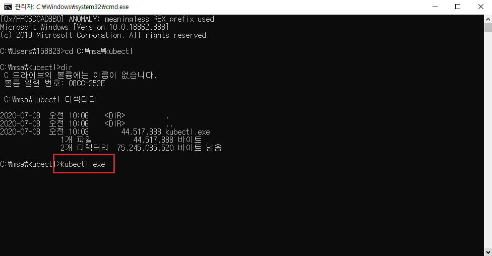 cmd에서 kubectl.exe 파일이 설치된 경로로 이동한 후