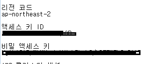추후 aws 설정을 위해 [리전 코드], [액세스 키 ID], [비밀 액세스 키] 세 가지 정보를 따로 저장해놓는다.