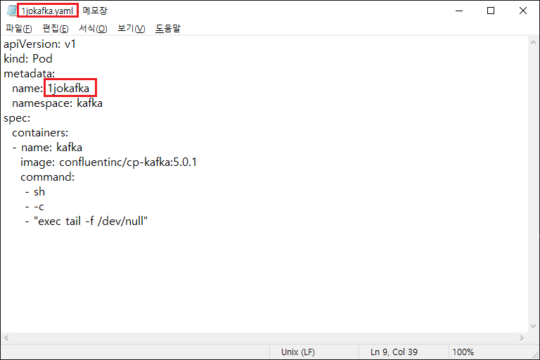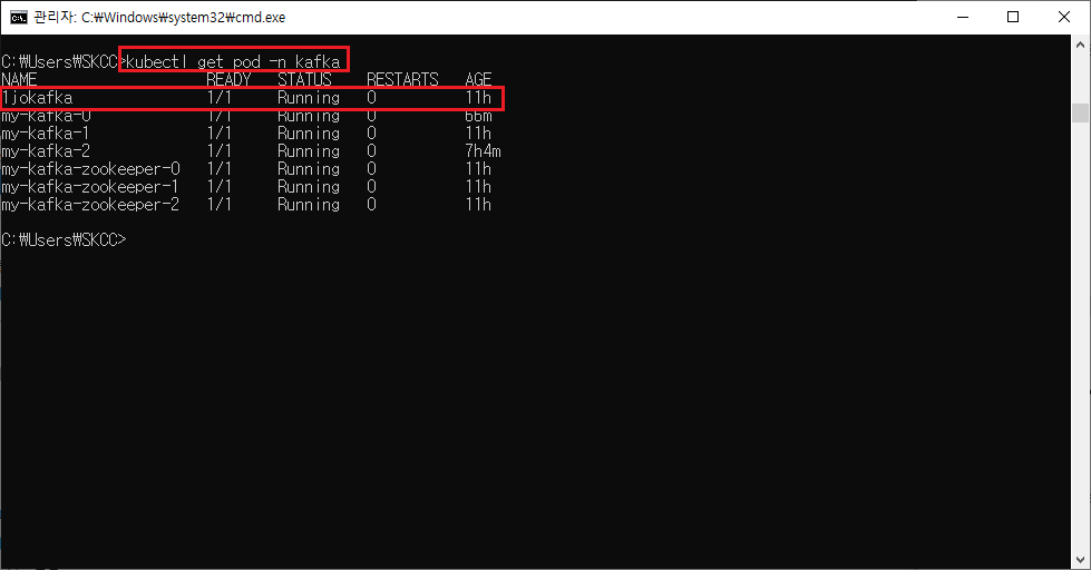 위 명령어로, kubectl 의 kafka라는 namespace에 1jokafka 이름으로 pod가 생성된다.