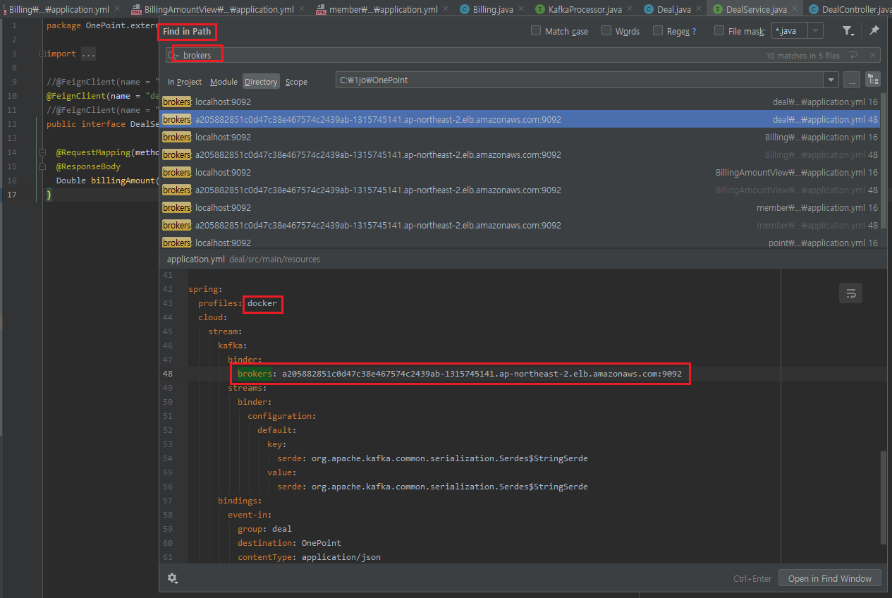 여기서 brokers 를 검색하면, profilese 값이 docker 인 설정 안에 brokers 부분이 있다.