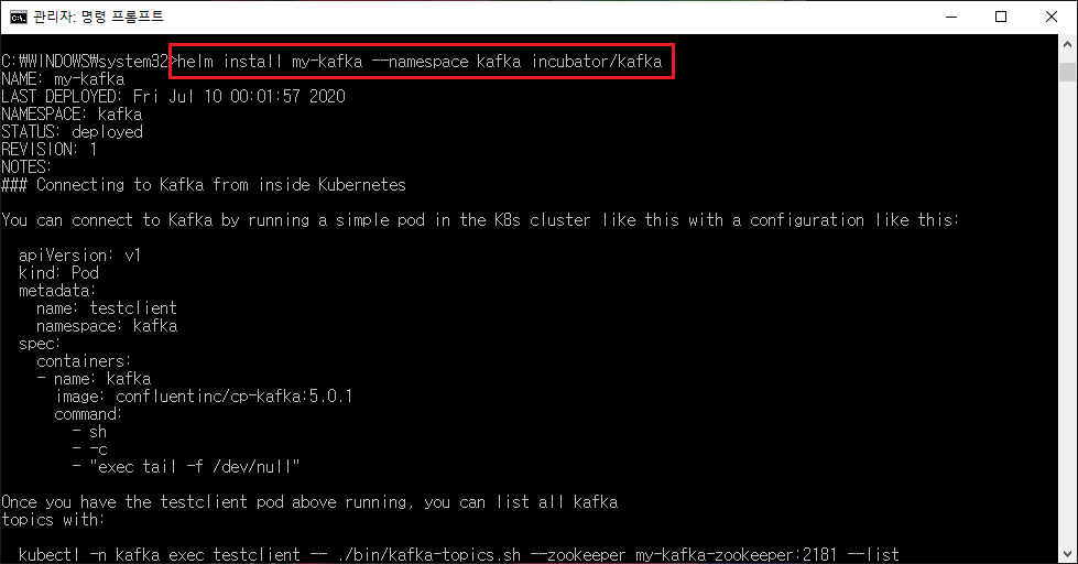 로컬에서 테스트할 때와 마찬가지로, kubernetes에도 kafka를 설치한다.