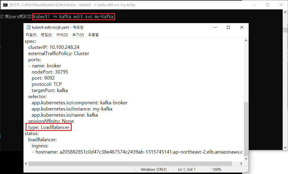 이제, 위에서 생성한 kafka를 외부 LoadBalancer로 변경한다.
