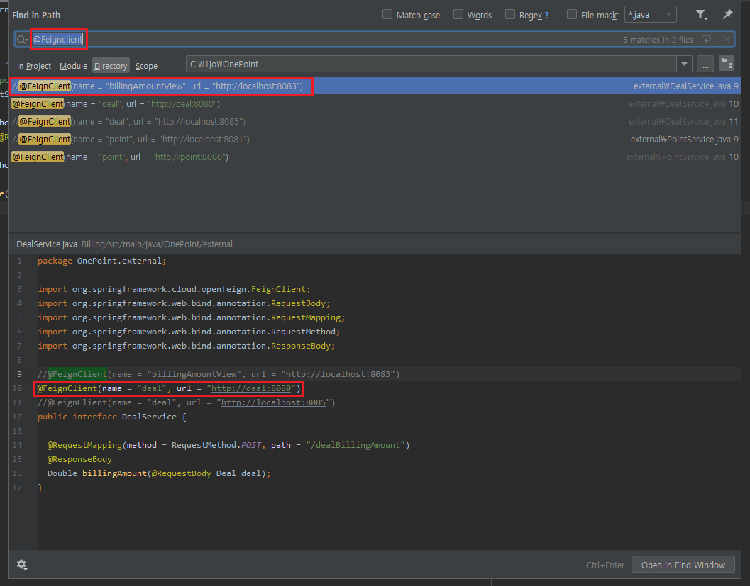 이 중, FeignClient 부분을 localhost에서 접근할 Aggregate 이름으로 수정을 해줘야 한다.