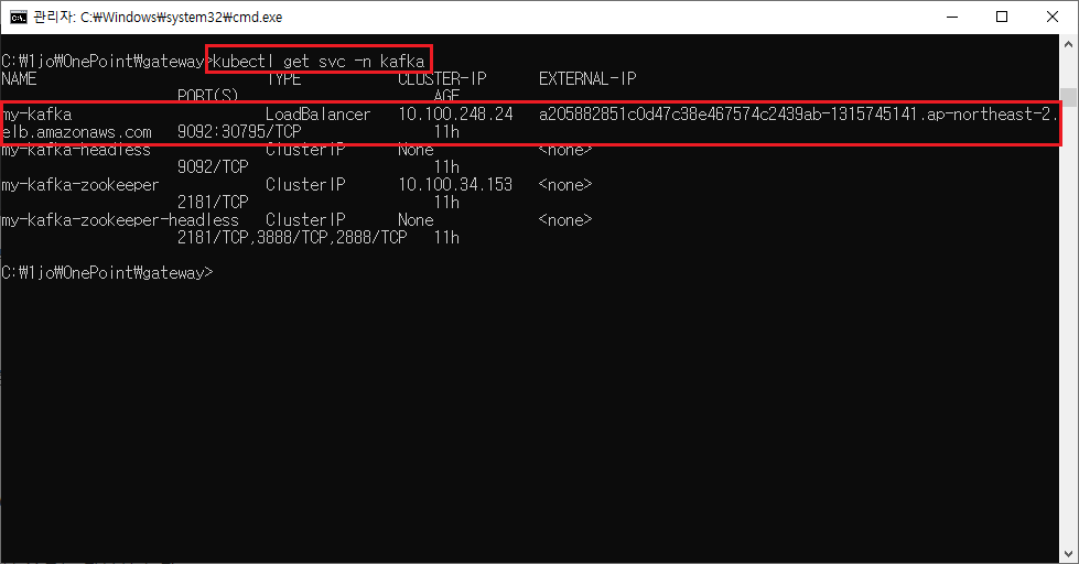my-kafka의 EXTERNAL IP 확인 방법은 다음과 같다.