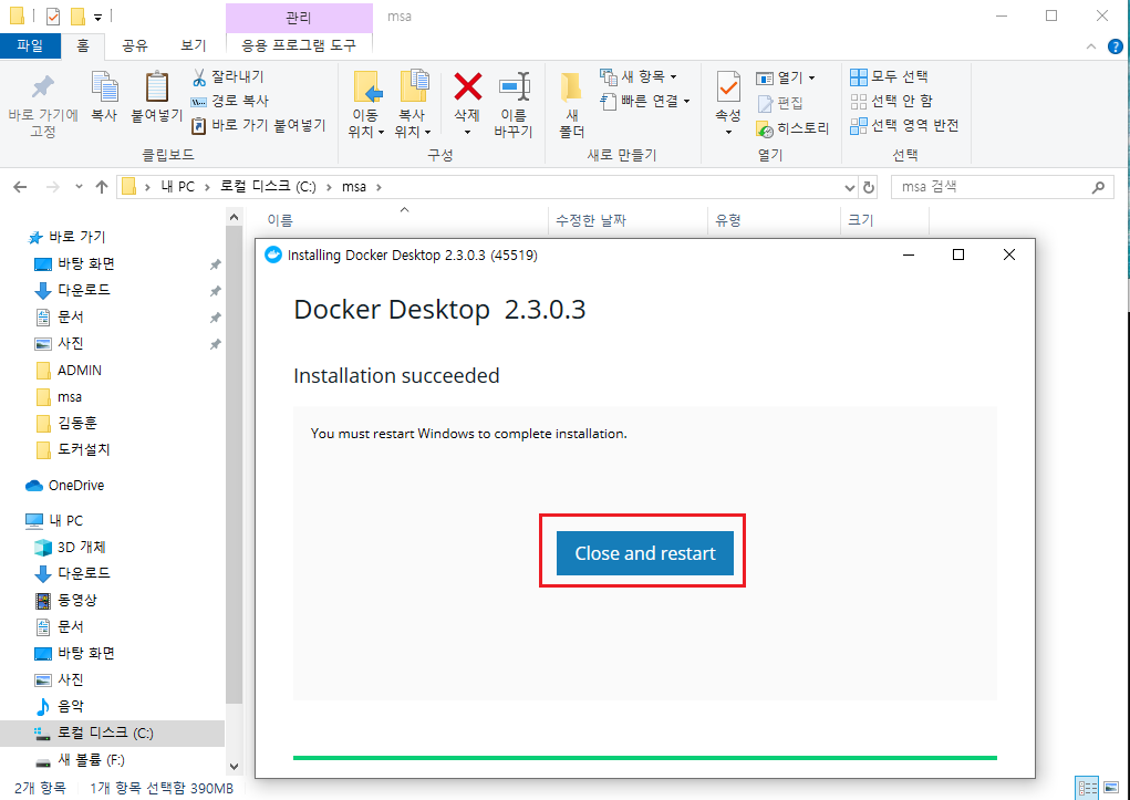 설치가 완료되면, [Close and restart]버튼이 보인다.
