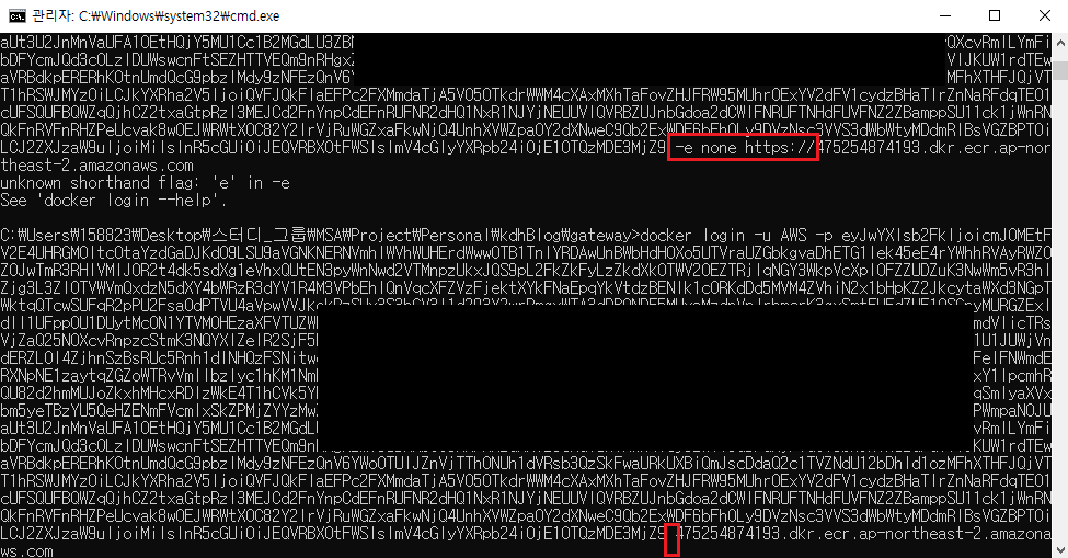 aws ecr get-login-password --region [지역 코드] | docker login --username AWS --password-stdin [Account-ID].dkr.ecp.[지역 코드].amazonaws.com