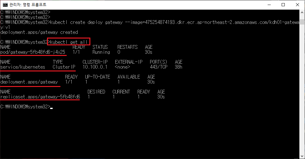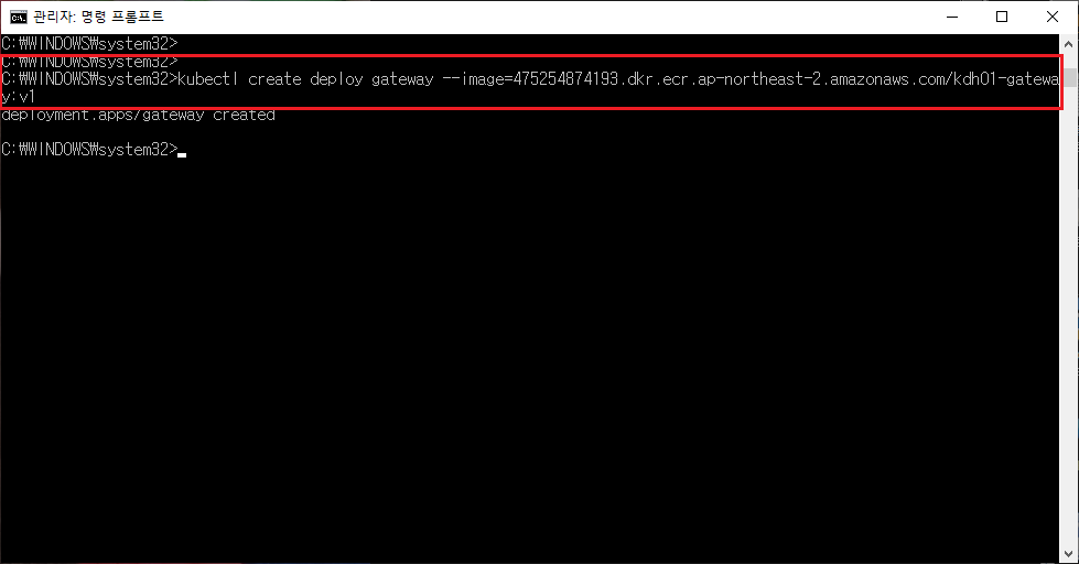 ex) kubectl create deploy gateway --image=475254874193.dkr.ecr.ap-northeast-2.amazonaws.com/kdh01-gateway:v1