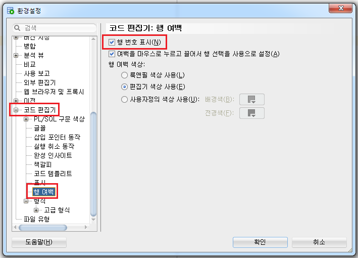 [코드 편집기] - [행 여백] 화면에서, 행 번호 표시 항목을 체크 후 확인
