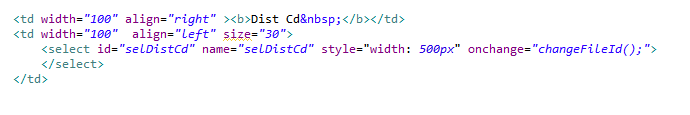 <select id="selDistCd" name="selDistCd" style="width: 500px" onchange="changeFileId();"></select>