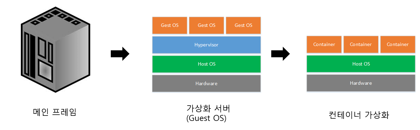 서버는 크게 메인 프레임 -> 가상화 서버(OS) -> 컨테이너 가상화 의 방향으로 변형되어 왔다.