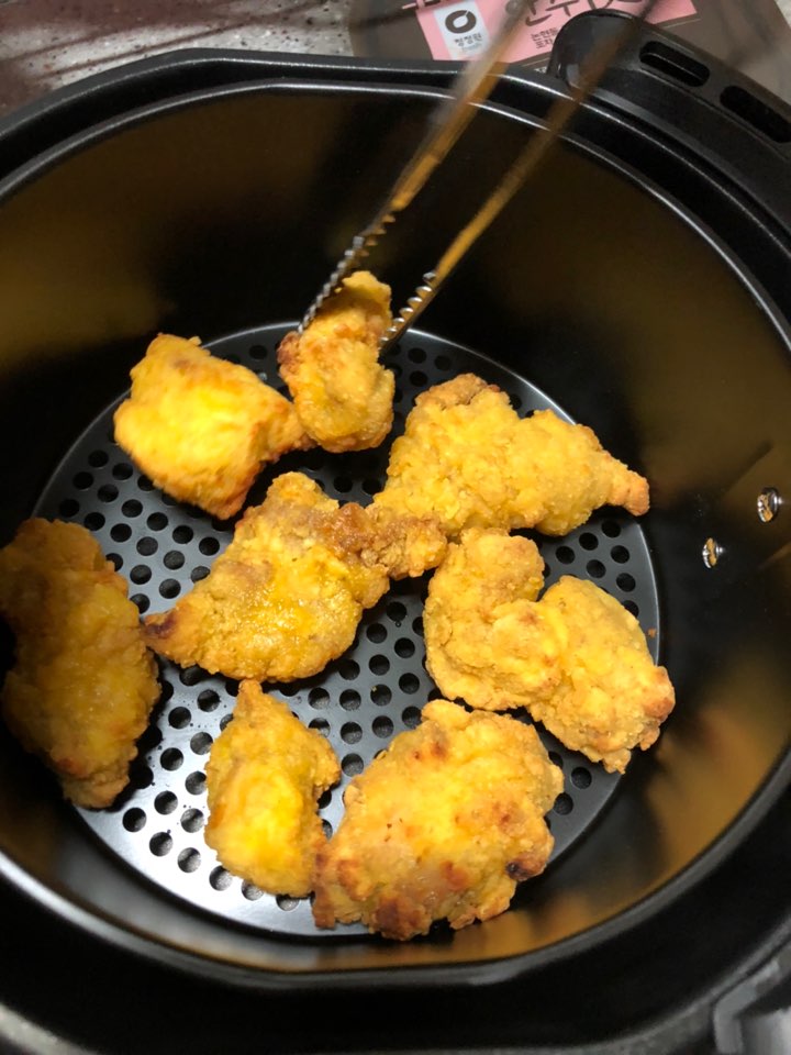 -에어 후라이기로 조리하니, 겉이 매우 바삭하고 기름기가 없어 담백하다.