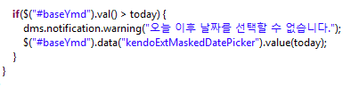 -> baseYmd 라는 id 값을 가진 DatePicker 값이 내일 이상일 경우, 경고 창 띄운 후 오늘 날짜로 변경