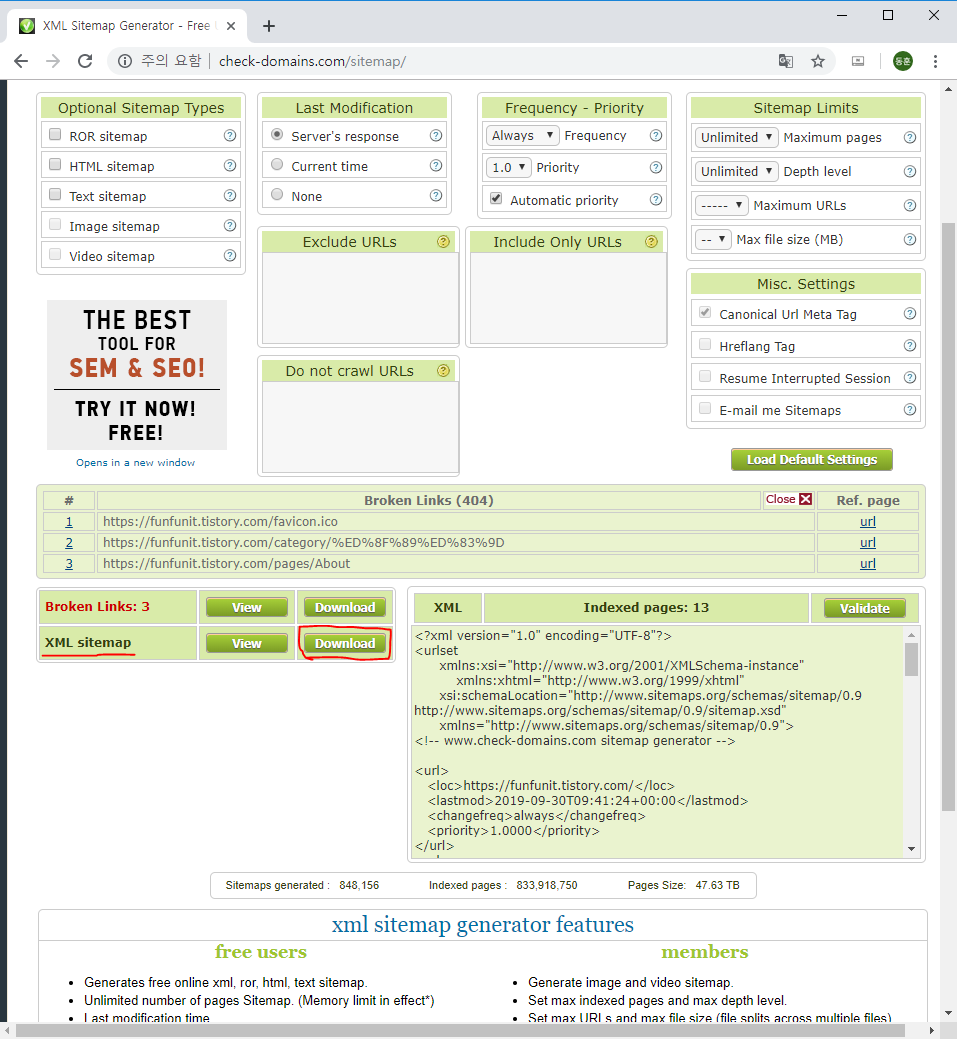 사이트맵 파일 생성이 가능한 여러 사이트들 중 이 사이트로 접속한다.