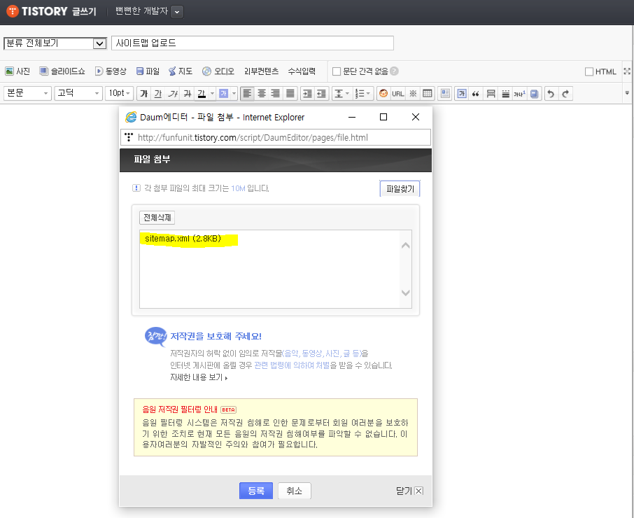 sitemap 파일을 첨부한 글 작성을 완료 후,