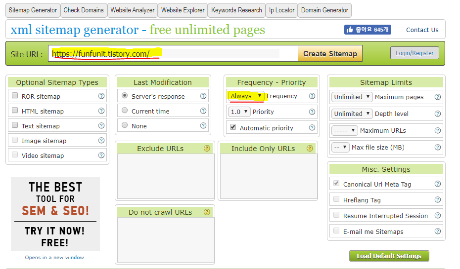 -Frequency 항목의 옵션은 Always로 설정(사이트맵 정보를 지속적으로 업데이트)