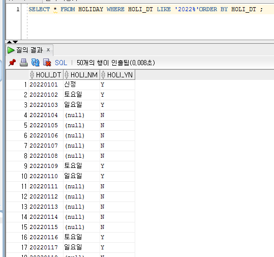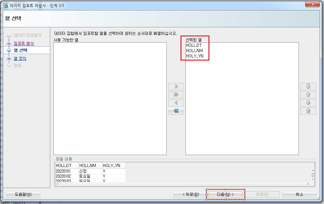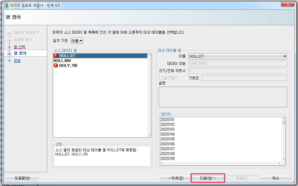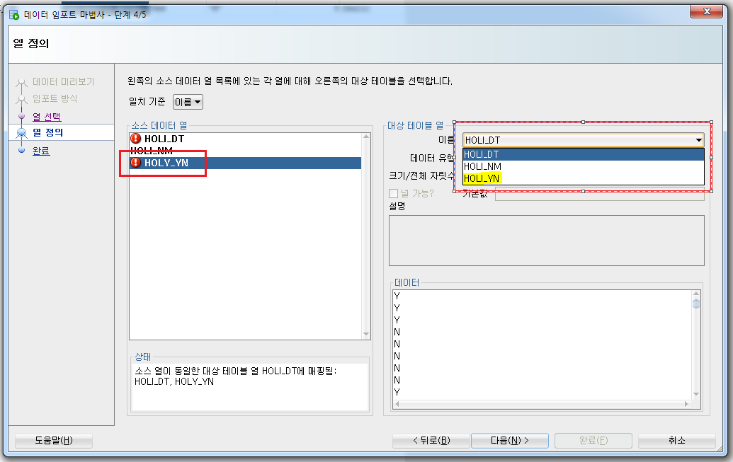 HOLY_YN 선택 후, 대상 테이블 열의 이름을 HOLI_YN 으로 변경