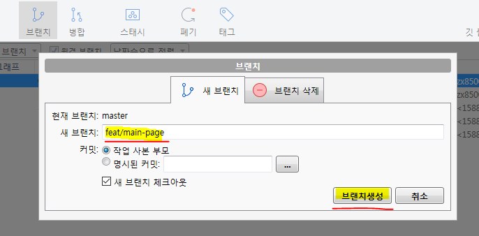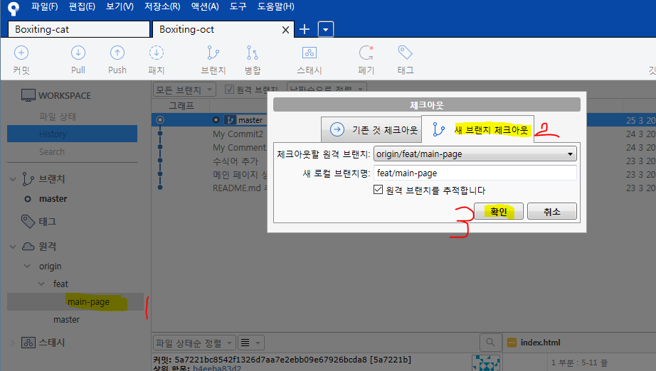 -확인 통해, 해당 브랜치로 체크아웃 가능