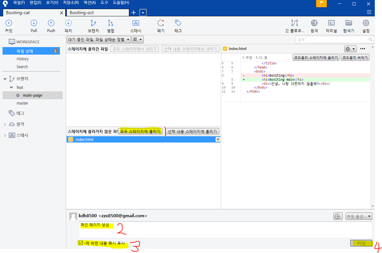 -커밋을 하기 위해, 소스 코드 수정 (당연히 Boxiting-cat 저장소에 있는 소스 파일 수정)