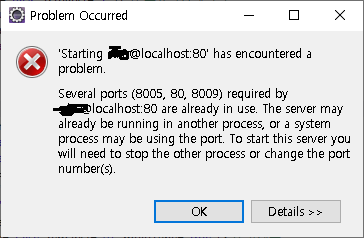 -8005, 80, 8009 포트 등을 다른 Process가 이미 사용 중이기 때문이다.