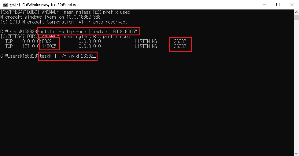 -taskill 명령어를 통해서 해당 pid를 강제 종료한다.