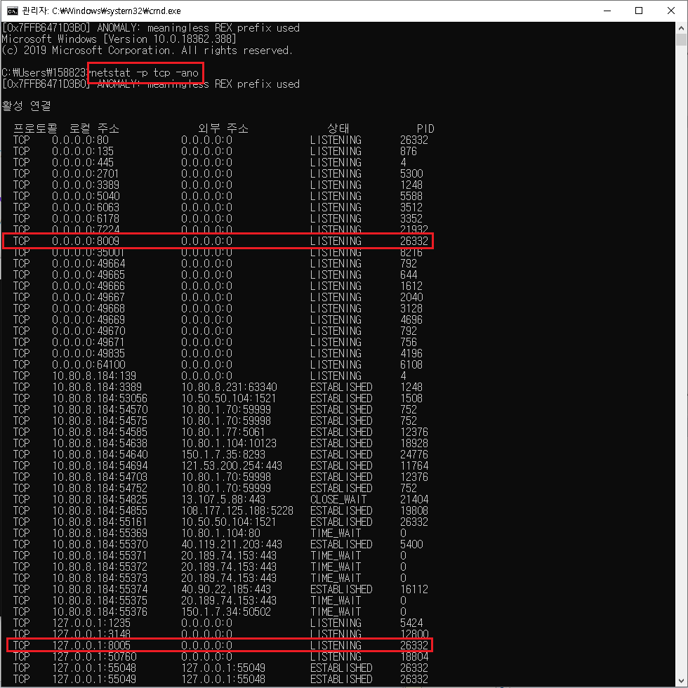 -netstat 명령어에 findstr 을 합쳐서 8009, 8005를 사용 중인 pid만 필터링한다.